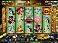Don’t worry about wearing a mask and dark colored clothing. And forget about looking for a crowbar (where do you even get one of those anyway?). All you need to play Cash Bandits is your computer. Start by making your bet and line selections. To do that, use the up and down arrows next to the Bet and Lines buttons. You can bet between a penny and $5 per line. And you can play one line, all 25, or anywhere in between. To lock in your bet, click the Spin button. Then hurry, because the cops are on their way.
